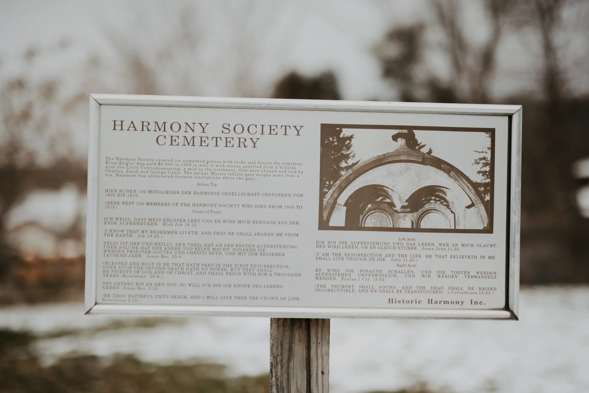 The Harmony Society Cemetery is truly unique. It is thought that more than 100 members of the Harmony Society’s first settlement are buried here, and all but one of those graves are unmarked. Johannes Rapp, the son of Harmony Society founder Johann Georg Rapp, is the only person buried at the site that has a commemorative stone honoring his life. Members of the Harmony Society believed they would be welcomed into heaven without needing postmortem recognition on Earth. In 1869, Mennonites were hired by the Harmonists to build the stone wall and revolving tablet gate that encloses the cemetery site in Harmony, PA.